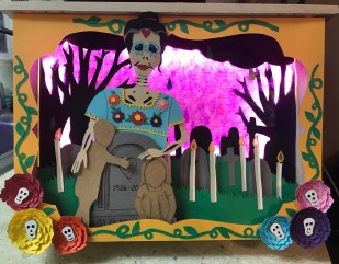 I began working on the flowers that will go around the border of the picture. I wanted to cut out each petal and make them look like African Marigolds (which are traditionally used in Day of the Dead celebrations), but I want to make several of them in different colors. It’s tedious work, but I like the way it’s coming out.