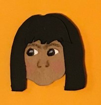 I worked on the smaller girl’s face some more. I cut out the eye sockets and added white paper to the back, then I drew in the iris on the white paper (before attaching it to the face base). I added some brows, her nose and her cheeks.
