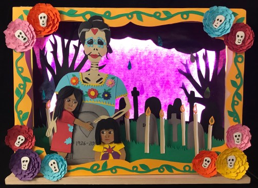 For the last two weeks, I continued working on the Day of the Dead themed shadow box. I continued trying to use more layers on the different characters in order to make them more three-dimensional and to make them more like real people look (but in paper form). I am so pleased with the results.