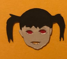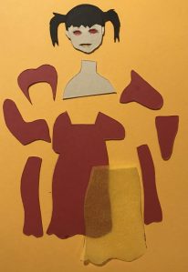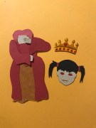 I put all the layers together and made the proper adjustments. There were some parts I had to trim and others I had to redo because they weren’t the right shape or size. I also made a crown and added a bit more detail to the queen’s hair. And I added white paper behind the queen’s mouth and drew in teeth.