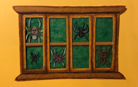 Lastly, I taped on green semi-transparent paper to the back and taped the spiders to the front.