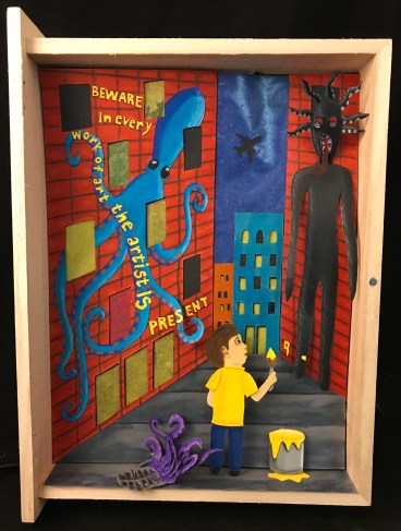 This light box came to life pretty much as I had envisioned it. I did intend for the black creature to be a lot scarier, but I’m so pleased with the way it came out, especially with the glowing face.
