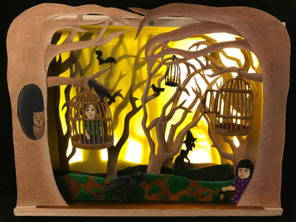 Overall, I was very pleased with the end result; however, if I could go back, I would make some minor changes to highlight certain elements more. For instance, before I glued down the layers, I would cut a hole to allow light to peek through the front and illuminate the lantern in the girl’s hand, the crow in the floor, and the owl in the tree. Those are some elements that could have added so much character to the light box, but instead they are lost in darkness. Lesson learned.